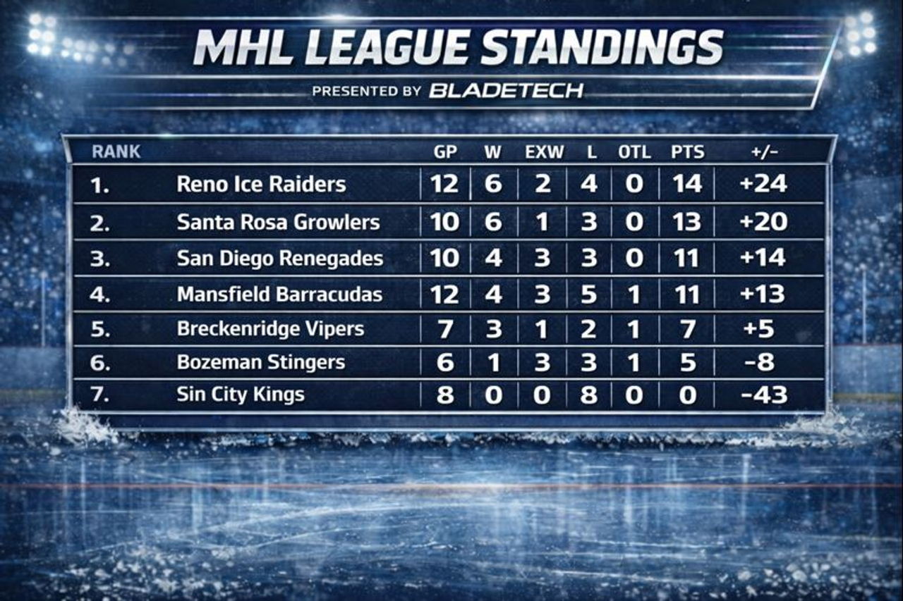 And Reno? Absolute statement. 7–1 domination in the Battle of Nevada. Fast, physical, relentless. That’s championship hockey, folks… and it shoots the Ice Raiders right to the top of the table to start 2026!