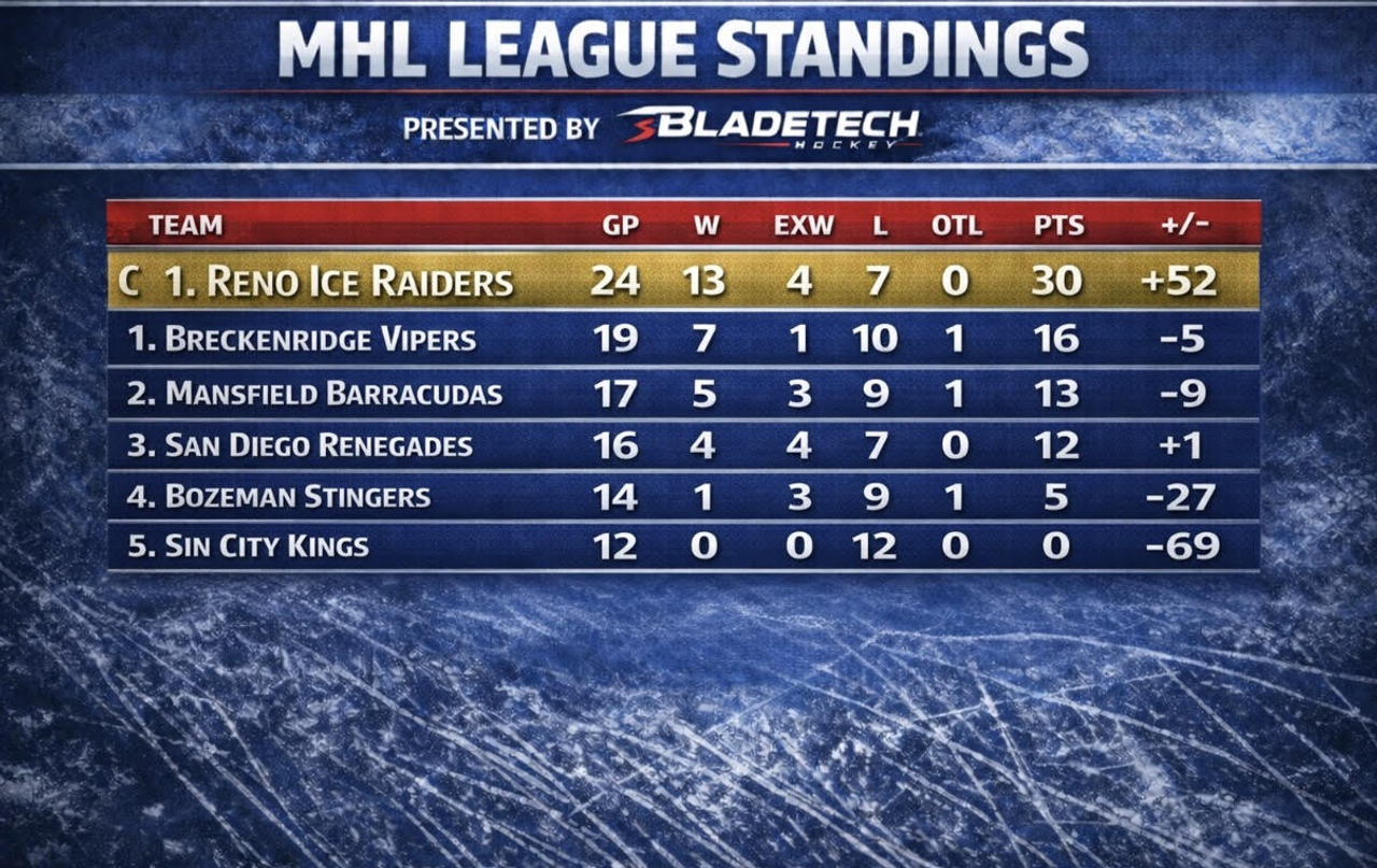 Meanwhile, the champs are just sitting back watching it all unfold. The Reno Ice Raiders locked up first place three weeks ago.. champions already! They’ll be waiting at home in Nevada to host the semi-final winner from the April 17th and 18th series!